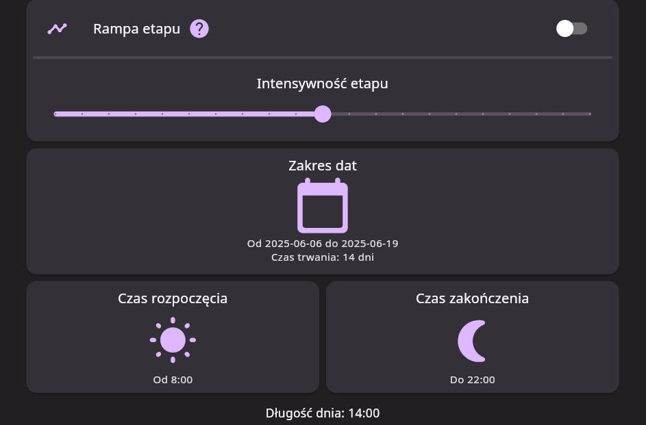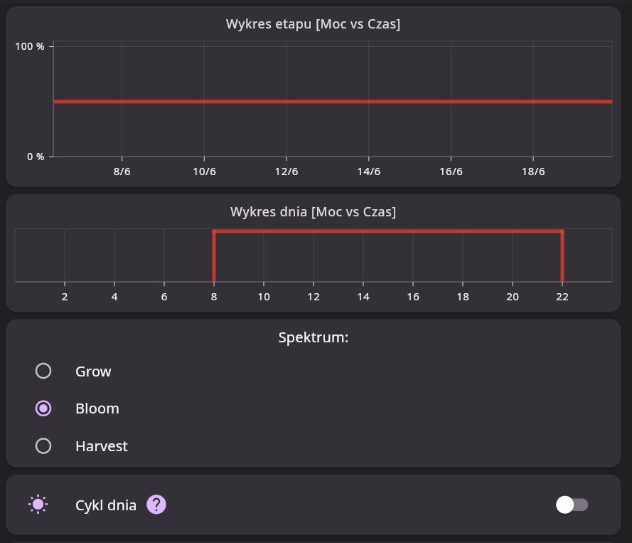 Die Änderung des Spektrums und der Intensität des Lichts ist nur einen Klick entfernt. Stellen Sie das Pflanzenlicht am Morgen ein, wechseln Sie am Nachmittag zum Blütespektrum und dimmen Sie es nachts – alles über die App.